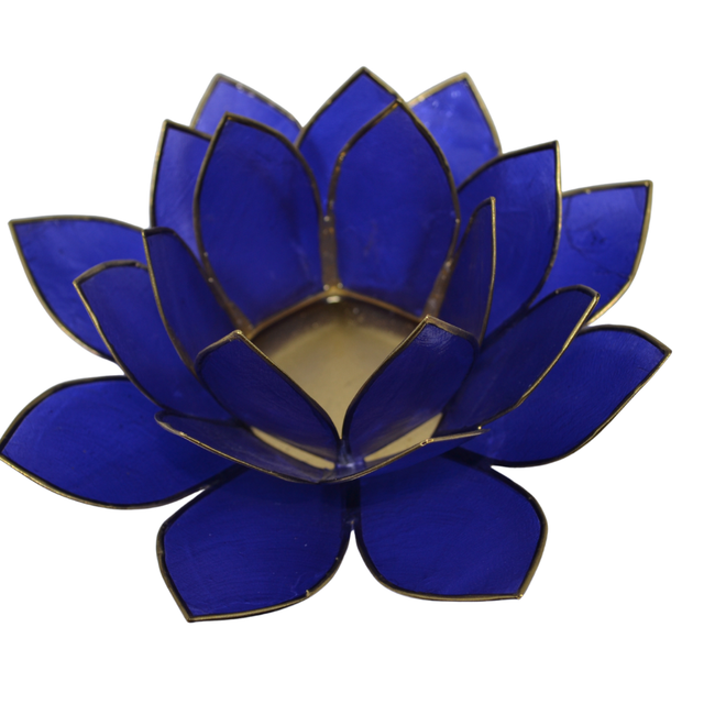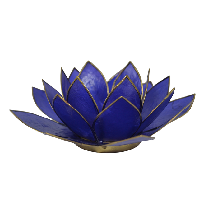 Illuminez votre espace avec le Photophore Lotus en indigo, symbolisant le passage des ténèbres à la lumière et les sept centres d'énergie, les chakras. Fabriqué en coquilles de Capiz, ce magnifique photophore mesure 13,5 x 5,5 cm et présente une élégante finition en laiton doré.