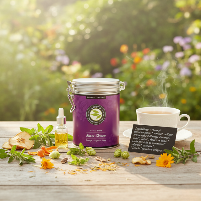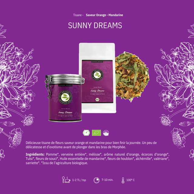 Terminez votre journée en douceur avec SUNNY DREAMS, une délicieuse tisane de fleurs signée Alveus.